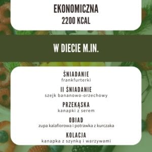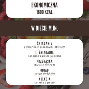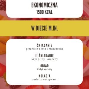 Dieta redukcyjna dla osób chcących schudnąć, jedząc przy tym zdrowo i smacznie. Wybierając dietę ekonomiczną zaoszczędzisz pieniądze. Nie znajdziesz tu ekstrawaganckich potraw, egzotycznych produktów i skomplikowanych przepisów. Jest to zmieniona wersja diety 1500 podstawowej, z której usunięte zostały droższe produkty np. ksylitol, awokado, łosoś, oliwa z oliwek itp, a potrawy skomponowane tak, by wartość odżywcza nie była mniejsza. Została ona skomponowana na tańszych produktach, które dostępne są w większości sklepów i w marketach typu Lidl, Biedronka. Przepisy opracowane zostały tak, by produkty nie marnowały się. Z dołączoną listą zakupów kupisz tylko to, czego faktycznie potrzebujesz w odpowiedniej ilości. Dodatkowo do diety została dołączona lista zamienników, dzięki której możesz wykorzystać produkty, które zalegają w domu lub te, które akurat są dostępne w promocyjnej cenie w Twoim sklepie. W diecie znajduje się 7 propozycji na śniadanie, II śniadanie, obiad i kolację. W jadłospisie jest wstępnie 5 posiłków z możliwością połączenia dwóch posiłków i rozłożeniu potraw na 4 posiłki dziennie. Żaden przepis się nie powtarza. Możesz ją stosować przez 1-3 miesiące.